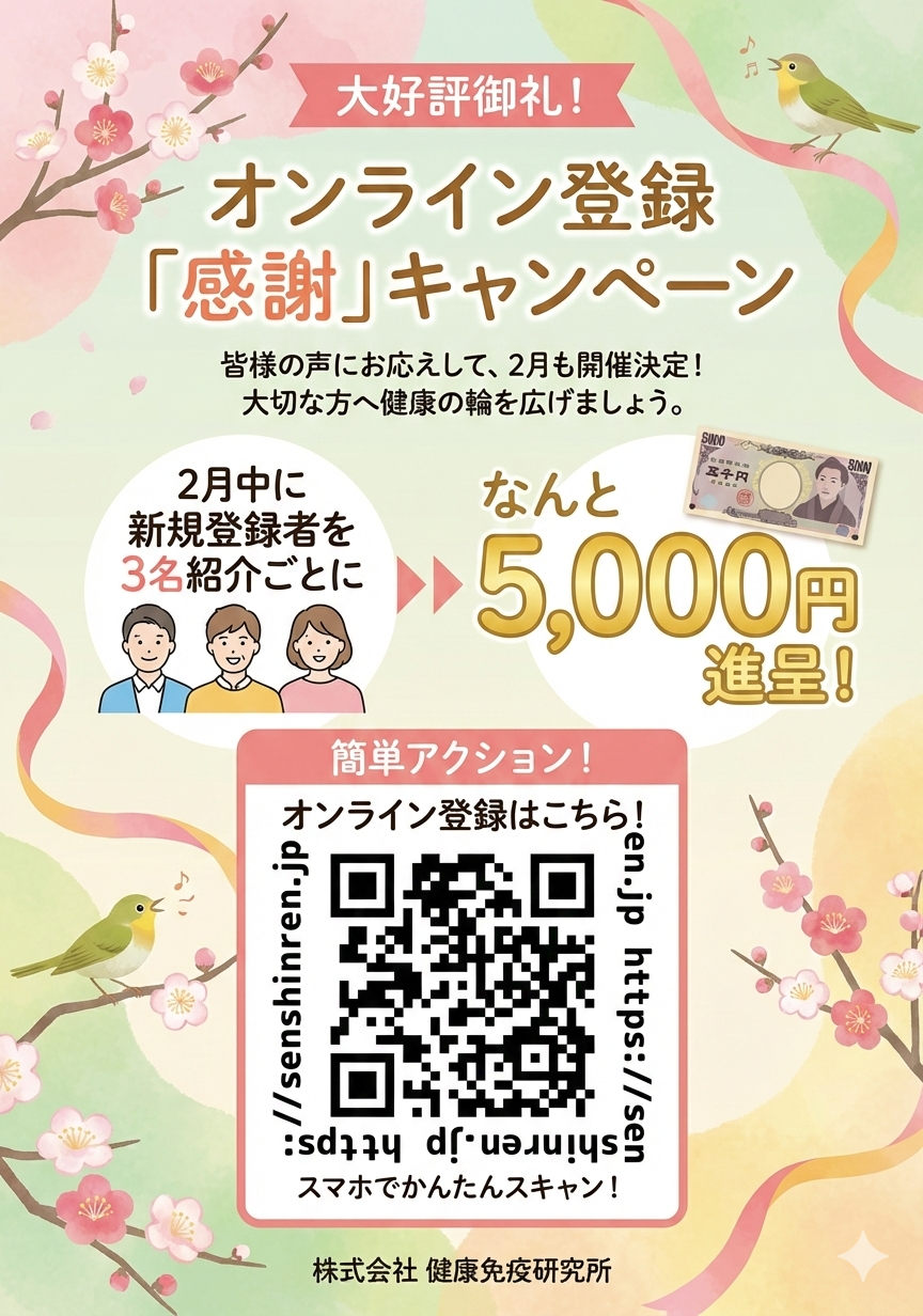 オンライン登録感謝キャンペーン 未分類 2026.01.31 1月好評につき2月も継続となりました。2月中に3名の紹介で5,000円進呈となります。1年で一番寒い時期ですので、センシンレンで心も体も温めて、懐も温めましょう・・・(^^♪キャンペーンpdfはこちら